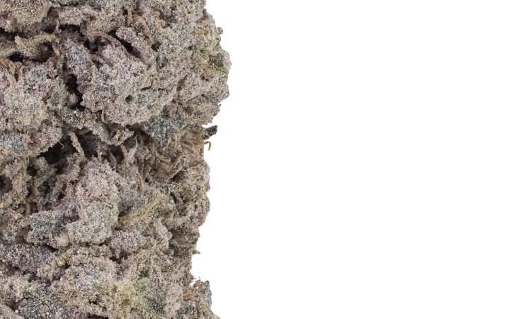 This medium-dense bud features a gently layered, tapered structure wrapped in muted purple-grey hues. A fine crystalline coat of THCA gives it a frosty, sugar-dusted finish, while soft green undertones and curled bracts add visual depth and balance.
