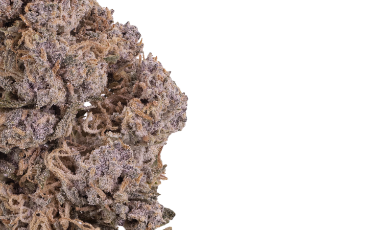 This medium-dense flower showcases deep purple hues highlighted by vibrant orange pistils, all topped with a thick, frosty layer of crystalline THCA. The result is a rich, textured appearance that emphasizes both quality and potency.