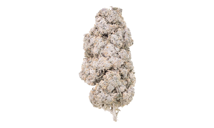 This medium-dense bud features a rounded, clustered structure with heavy crystalline THCA covering its surface, creating a bright, icy appearance. Soft orange pistils and muted green and lavender undertones peek through the snowy layer, giving the flower depth, texture, and a refined visual balance.